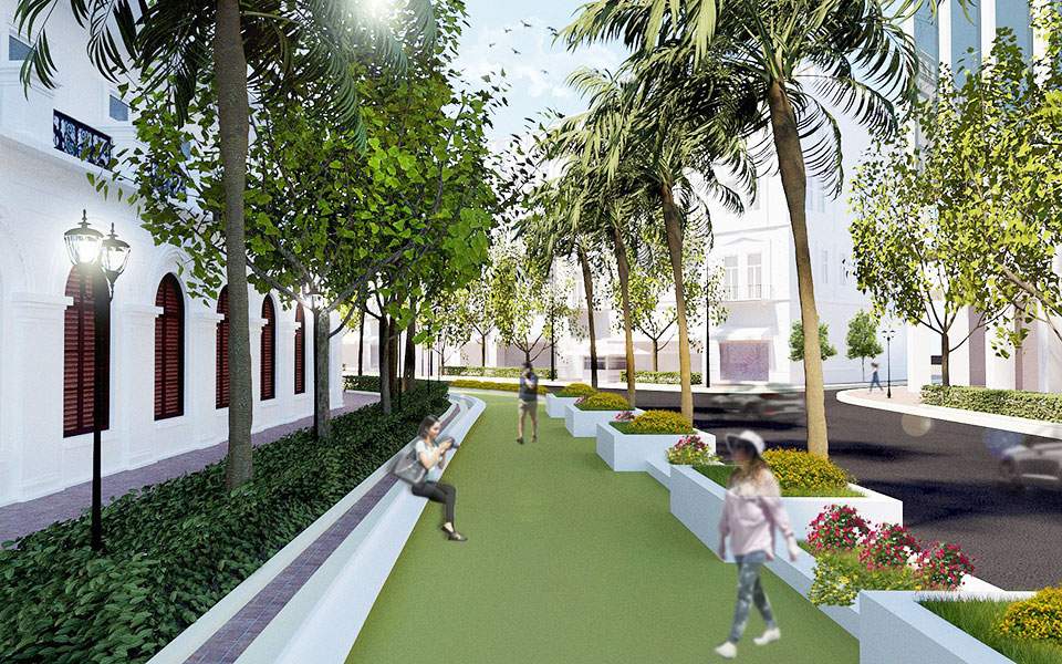 Επίσης, διαμορφώνεται ένας εντυπωσιακός πεζόδρομος, που θα καλύπτει δύο από τις υφιστάμενες λωρίδες κυκλοφορίας, μήκους 900 μέτρων και συνολικής έκτασης 7.000 τ.μ. στον οποίο θα υπάρχουν παγκάκια, φυτά και περισσότερες από 250 ζαρντινιέρες.