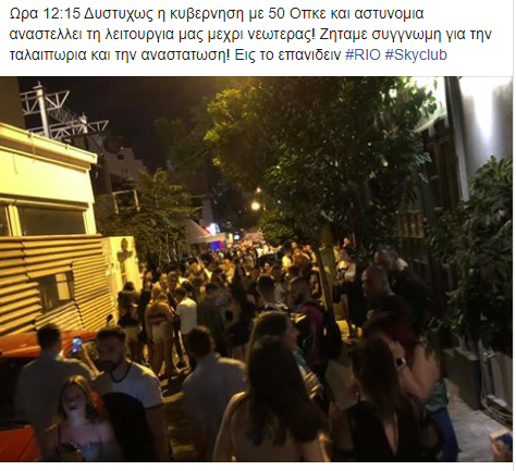 Μάλιστα την είδηση ανέβασε στην σελίδα του στο Facebook το ίδιο το κατάστημα, όπου τη συνόδευε με μια φωτογραφία από τη λαοθάλασσα από κόσμο τη στιγμή που αποχωρούσαν από το μπαρ λόγω της εφόδου των αστυνομικών Αρχών.