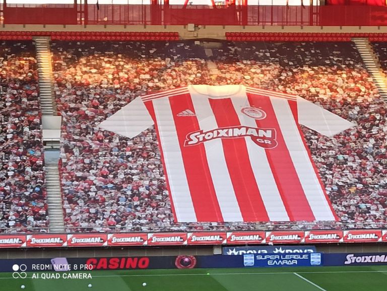Στην κεντρική κερκίδα που βρίσκεται απέναντι από τα δημοσιογραφικά, έχει τοποθετηθεί μια πολύ μεγάλη φανέλα του Ολυμπιακού, ενώ αριστερά και δεξιά υπάρχουν… οπαδοί.