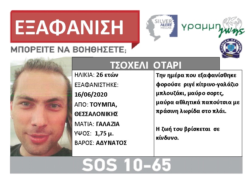 Αναζητείται από τους οικείους του και την αστυνομία ο 26χρονος ΤΣΟΧΕΛΙ ΟΤΑΡΙ, ο οποίος εξαφανίστηκε χθες Τρίτη από την περιοχή της Τούμπας, στη Θεσσαλονίκη.