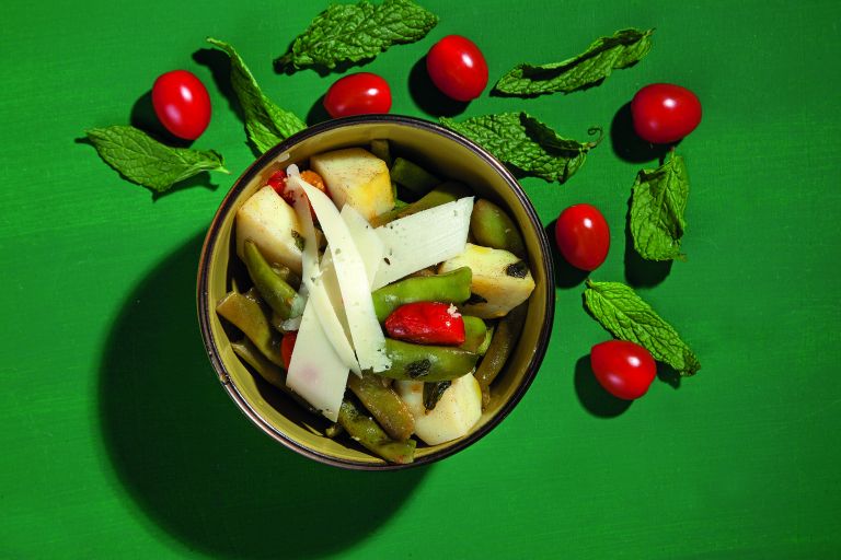 Βάζουμε τα φασολάκια σε μια φαρδιά κατσαρόλα με ½ φλ. ελαιόλαδο και τα σοτάρουμε για 6-8 λεπτά σε δυνατή φωτιά. Παράλληλα, βράζουμε τις πατάτες για 5 λεπτά (θέλουμε να «κρατάνε»). Τις βγάζουμε από το νερό, τις ξεφλουδίζουμε και τις σπάμε με τα χέρια μας σε κομμάτια. Επίσης, πλένουμε και κόβουμε τα ντοματίνια στη μέση. Τα αλατίζουμε ελαφρά σε ένα μπολ.
