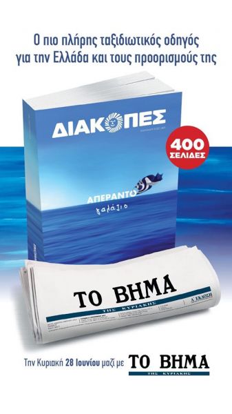 Με το Βήμα της Κυριακής: ΔΙΑΚΟΠΕΣ Ο πιο πλήρης ταξιδιωτικός οδηγός για την Ελλάδα και τους προορισμούς της! Μία πολυτελής έκδοση 400 σελίδων! Κυκλάδες, Ιόνιο, Σποράδες, Βόρειο Αιγαίο, Κρήτη, Μακεδονία, Πελοπόννησος, Στερεά Ελλάδα, Εύβοια Πλούσιο φωτογραφικό υλικό, παραλίες, αξιοθέατα, διαδρομές, γαστρονομία, εναλλακτικός τουρισμός και όλες οι απαραίτητες πληροφορίες για να οργανώσετε τις διακοπές σας!