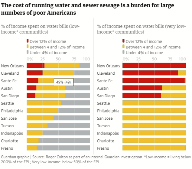 Εκατομμύρια Αμερικανοί βρίσκονται αντιμέτωποι με μία τεράστια αύξηση στον λογαριασμό παροχής νερού, τον οποίο αδυνατούν να πληρώσουν, με αποτέλεσμα να κινδυνεύουν είτε με διακοπή της ύδρευσης είτε και να χάσουν τα σπίτια τους, σε ορισμένες περιπτώσεις, σύμφωνα με έρευνα του Guardian.
