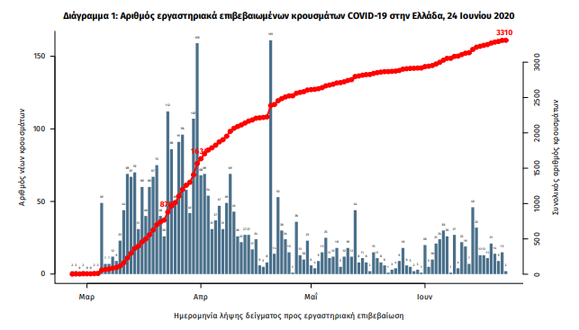 730 (22.1%) θεωρούνται σχετιζόμενα με ταξίδι από το εξωτερικό και 1.848 (55.8%) είναι σχετιζόμενα με ήδη γνωστό κρούσμα.