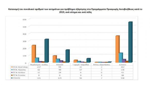 Στα Προγράμματα Προαγωγής Αυτοβοήθειας προσήλθαν για πρώτη φορά 291 διαφορετικά άτομα -αριθμός παρόμοιος με το 2018, οπότε και προσήλθαν 310 διαφορετικά άτομα. Από αυτά τα άτομα τα 147 είχαν πρόβλημα με τη χρήση παράνομων ψυχοτρόπων ουσιών, τα 98 με το αλκοόλ, τα 40 με τα τυχερά παιχνίδια και 6 με άλλες εξαρτητικές συμπεριφορές, π.χ. φαγητό, νομίμως συνταγογραφούμενες ουσίες.