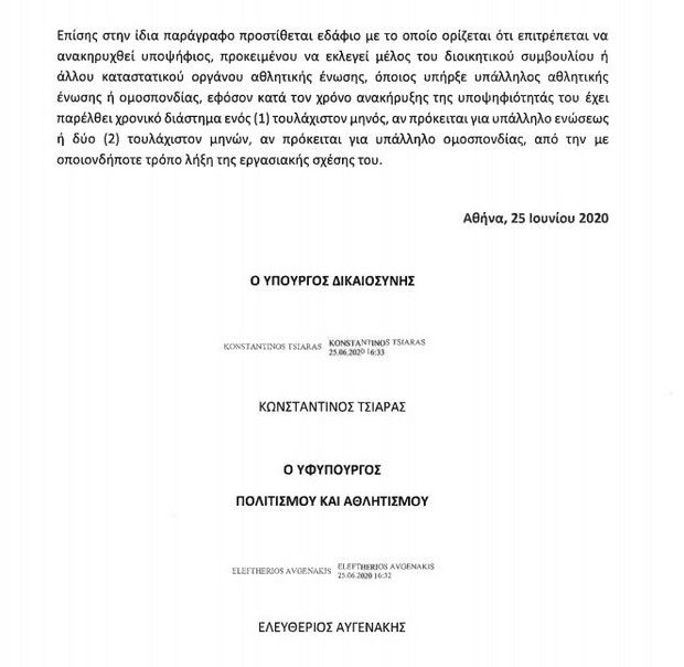 Στο νομοσχέδιο που κατέθεσε το υπουργείο Δικαιοσύνης, όμως, προστέθηκαν τροπολογίες που αφορούν τον επανακαθορισμό του πλαισίου που διέπει τα κωλύματα εγγραφής-περιορισμούς συμμετοχής σε αθλητικά σωματεία και ενώσεις.
