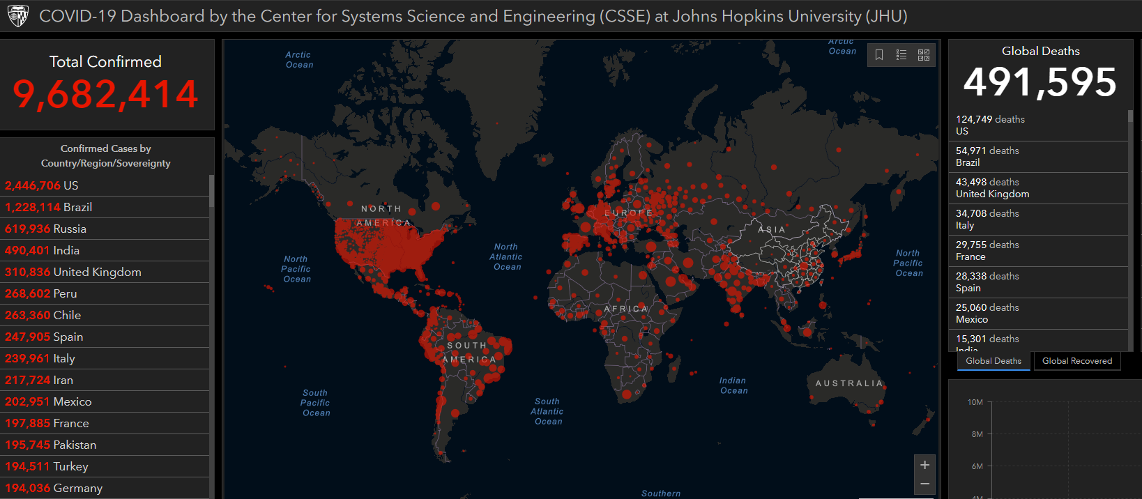 Σύμφωνα με απολογισμό που συνέταξε το Γαλλικό Πρακτορείο βάσει επίσημων πηγών σήμερα στις 22.00 ώρα Ελλάδος, η πανδημία του νέου κοροναϊού έχει προκαλέσει τον θάνατο τουλάχιστον 490.771 ανθρώπων παγκοσμίως μετά την εμφάνιση του ιού στην Κίνα, τον Δεκέμβριο,