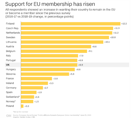Στις 26 χώρες που συμμετείχαν, τέσσερις εκ των οποίων δεν ανήκουν στα κράτη μέλη, σημειώνεται αύξηση της υποστήριξης της συμμετοχής στην ΕΕ, πράγμα που δείχνει ότι οι εκτιμήσεις πως και άλλες χώρες θα έσπευδαν να ακολουθήσουν το παράδειγμα της Βρετανίας ήταν εντελώς αβάσιμες.