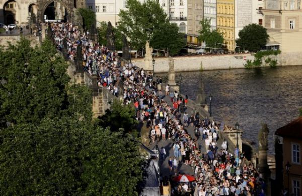 Χιλιάδες άνθρωποι κάθισαν χθες Τρίτη σε ένα τραπέζι μήκους 500 μέτρων στην γέφυρα του Καρόλου στην Πράγα για να γιορτάσουν την άρση των μέτρων που είχαν ληφθεί στην Τσεχία για τον περιορισμό της επιδημίας του κοροναϊού
