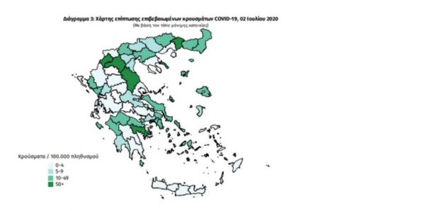 Τα συνολικά κρούσματα στη χώρα μας ανέρχονται σε 3458, εκ των οποίων το 55.0% άνδρες αφορά άνδρες. Τα 785 κρούσματα (22.7%) θεωρούνται σχετιζόμενα με ταξίδι από το εξωτερικό και 1914 (55.3%) είναι σχετιζόμενα με ήδη γνωστό κρούσμα.