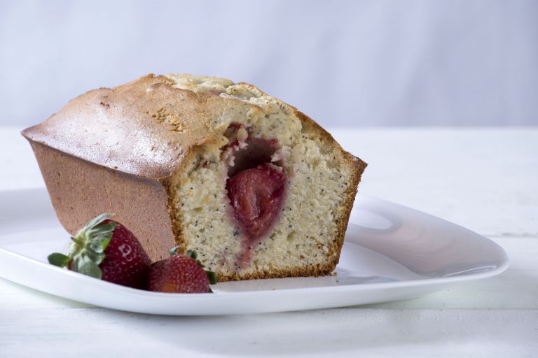 Προθερμαίνουμε τον φούρνο στους 180°C. Βουτυρώνουμε μια μακρόστενη φόρμα διαστάσεων 22×13 εκ. Κοσκινίζουμε σε ένα μπολ το αλεύρι με το μπέικιν πάουντερ. Χτυπάμε στο μίξερ το βούτυρο με τη ζάχαρη μέχρι να γίνουν κρέμα. Χαμηλώνουμε την ταχύτητα του μίξερ και προσθέτουμε ένα-ένα τα αβγά και στη συνέχεια το γιαούρτι, το ξύσμα και τον παπαρουνόσπορο. Αφού ενσωματωθούν, ρίχνουμε σιγά-σιγά το αλεύρι με το μπέικιν, χτυπώντας αρχικά στη χαμηλή και μετά στη μεσαία ταχύτητα του μίξερ. Προσθέτουμε τον χυμό και συνεχίζουμε το χτύπημα μέχρι να ομογενοποιηθεί το μείγμα. Το αδειάζουμε στη φόρμα και βυθίζουμε στο κέντρο, κατά μήκος του κέικ τις φράουλες ολόκληρες, τη μία δίπλα στην άλλη. Ψήνουμε για 40-50 λεπτά και αφήνουμε να κρυώσει πριν το κόψουμε