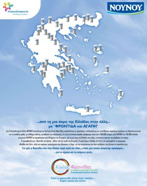 Ενισχύοντας περισσότερους από 40 Δήμους και 45 φορείς σε όλη τη χώρα, η FrieslandCampina Hellas – ΝΟΥΝΟΥ προσέφερε συνολικά πάνω από 1.900.000 ποτήρια γάλα ΝΟΥΝΟΥ και 140.000 κύπελλα γιαουρτιού ΝΟΥΝΟΥ κατά τη διάρκεια της πανδημίας, μέσω του προγράμματος «Φροντίδα και Αγάπη». Οι ωφελούμενοι του προγράμματος αγγίζουν τους 44.000 συμπολίτες μας στους δέκα μεγαλύτερους Δήμους της χώρας (Αθηνών, Θεσσαλονίκης, Πειραιά, Ηρακλείου, Λαρισαίων, Βόλου, Περιστερίου, Ρόδου, Ιωαννίνων, Πύργου).
