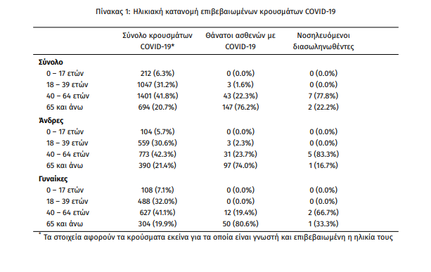 Η μέση ηλικία των κρουσμάτων είναι 47 έτη (εύρος 0 έως 102 ετών), ενώ η μέση ηλικία των θανάτων είναι 76 έτη (εύρος 35 έως 102 ετών). Η ηλικιακή κατανομή των (α) συνολικών κρουσμάτων, (β) των περιστατικών που κατέληξαν σε θάνατο και (γ) των ασθενών που νοσηλεύονται διασωληνωμένοι, είναι η ακόλουθη: