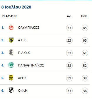 Οι Πειραιώτες βρίσκονται στο +20 από την ΑΕΚ, με τη διαφορά να αποδεικνύει περίτρανα ότι ο Ολυμπιακός είναι έτη φωτός μπροστά από τους δύο Δικεφάλους. Από εκεί και πέρα, στην 4η θέση βρίσκεται ο Παναθηναϊκός με 52 βαθμούς, στην 5η ο Αρης με 38 και στην 6η ο ΟΦΗ με 36.