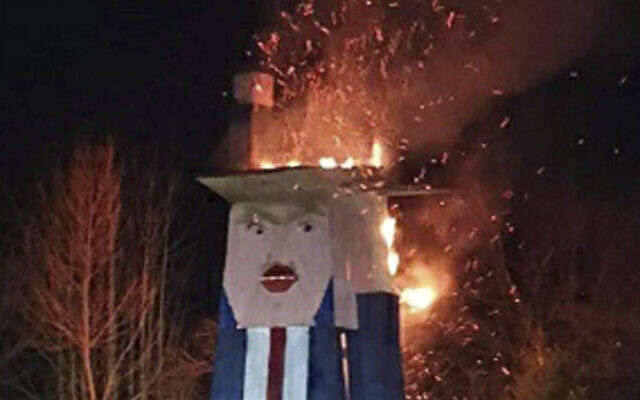 Τον Ιανουάριο, μεγάλο ξύλινο άγαλμα που έμοιαζε με τον Ντόναλντ Τραμπ (φωτογραφία AP, κάτω), το οποίο σχεδιάστηκε από τοπικό καλλιτέχνη πέρυσι, κάηκε στην πόλη Μοράβτζε της Σλοβενίας, ανατολικά της πρωτεύουσας Λιουμπλιάνα.
