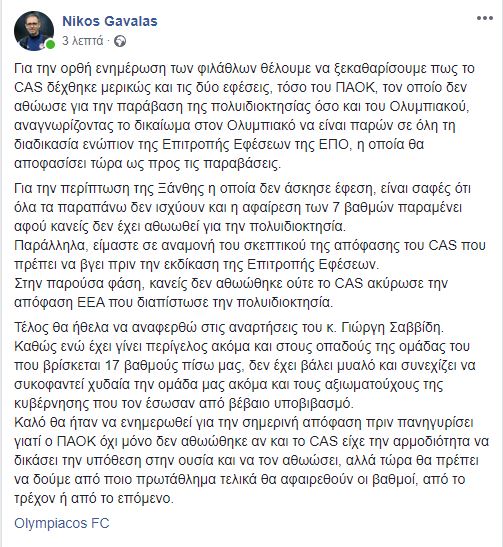«Για την ορθή ενημέρωση των φιλάθλων θέλουμε να ξεκαθαρίσουμε πως το CAS δέχθηκε μερικώς και τις δύο εφέσεις, τόσο του ΠΑΟΚ, τον οποίο δεν αθώωσε για την παράβαση της πολυιδιοκτησίας όσο και του Ολυμπιακού, αναγνωρίζοντας το δικαίωμα στον Ολυμπιακό να είναι παρών σε όλη τη διαδικασία ενώπιον της Επιτροπής Εφέσεων της ΕΠΟ, η οποία θα αποφασίσει τώρα ως προς τις παραβάσεις.