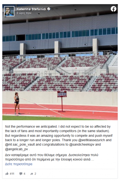 «Δεν κατάφερα αυτό που ήθελα σήμερα. Δυσκολεύτηκα πολύ περισσότερο από ό,τι περίμενα με την έλλειψη κοινού αλλά κυρίως με την έλλειψη συναθλητριών/αντιπάλων στον αγωνιστικό χώρο. Παρ΄ όλα αυτά, ήταν μια μοναδική εμπειρία και μια ωραία ευκαιρία να ωθήσω τον εαυτό μου σε μεγαλύτερα άλματα».