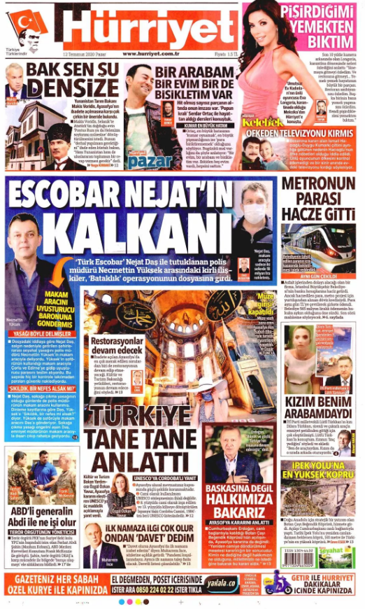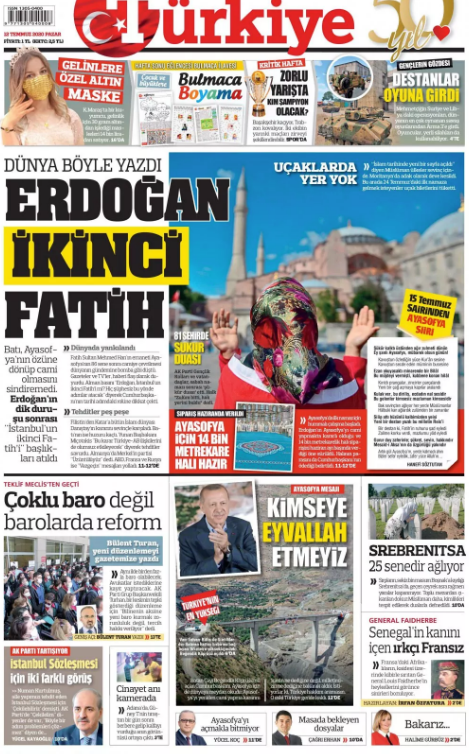 Στα πρώτα θέματα των ΜΜΕ συντηρούν το θέμα της Αγίας Σοφίας οι Τούρκοι, οι οποίοι συνεχίζουν τα πανηγυρικά δημοσιεύματα, εν αναμονή της πρώτης μουσουλμανικής προσευχής στον ναό, μετά από 86 χρόνια