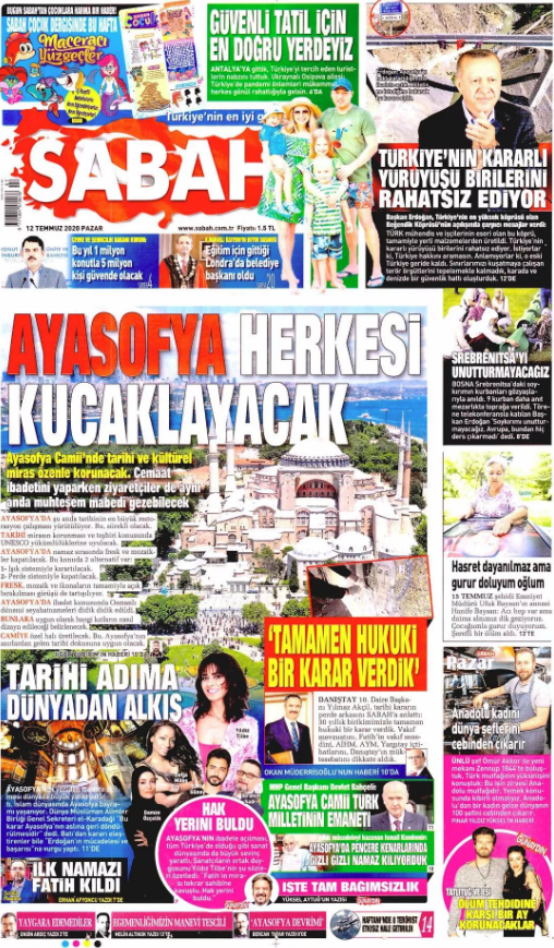 Με την Sabah να κρατάει λίγο πιο χαμηλούς τόνους και να αναφέρει πως «η Αγία Σοφία θα τους αγκαλιάσει όλους. Όταν θα γίνεται η προσευχή, οι επισκέπτες θα συνεχίζουν την περιήγηση τους».