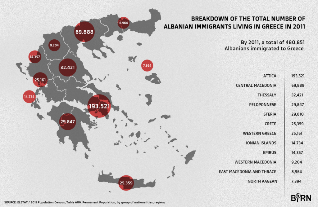 Σήμερα, περίπου 500.000 Αλβανοί έχουν μόνιμη κατοικία στην Ελλάδα και συγκροτούν σε ποσοστό 51% τον μεγαλύτερο μεταναστευτικό πληθυσμό της χώρας.