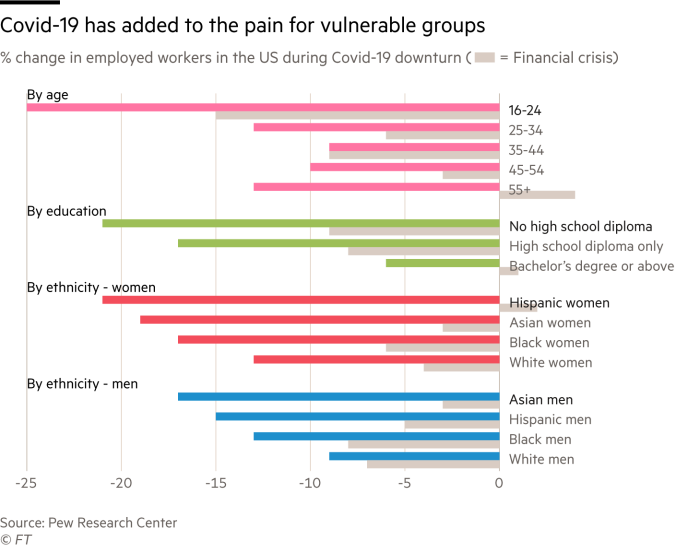 Δεύτερον, έπληξε περισσότερο τις γυναίκες από τους άντρες και τους ανειδίκευτους εργαζομένους από τους ειδικευμένους. Τούτο εξηγείται από τα σχετικά υψηλά ποσοστά γυναικείας απασχόλησης σε κάποιους τομείς που δέχθηκαν ισχυρό πλήγμα και τη δυνατότητα μιας μεγάλης μερίδας ειδικευμένων εργαζομένων να δουλέψουν με ασφάλεια από το σπίτι.