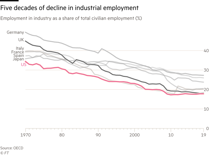 Η πτώση της μεταποίησης ως πηγής απασχόλησης είχε δυσμενείς συνέπειες σε πόλεις και περιοχές στις οποίες ήταν συγκεντρωμένες. Όταν τα εργοστάσια κλείνουν ή απολύουν μεγάλο μέρος του εργατικού δυναμικού, η ευρύτερη τοπική οικονομία επηρεάζεται επίσης δυσμενώς. Τέτοιες «ξεχασμένες» περιοχές αποτελούν βασικό συστατικό του συνασπισμού των δυσαρεστημένων. Εν τω μεταξύ, πόλεις, ειδικά οι μεγάλες μητροπόλεις, αποτελούν δυναμικά κέντρα για μορφωμένους ανθρώπους και νέες δραστηριότητες, όπως έχει επισημάνει ο οικονομολόγος του Πανεπιστημίου της Οξφόρδης Πολ Κόλιερ.