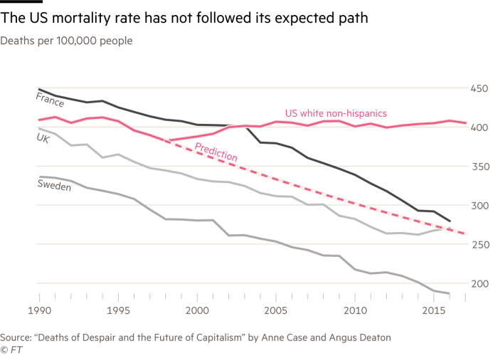 Στο Deaths of Despair and the Future of Capitalism, η Αν Κέις και ο Άνγκους Ντίτον υποστηρίζουν ότι οι εξελίξεις αυτές έχουν προκαλέσει σε πολλούς σοβαρά προβλήματα υγείας. Επισημαίνουν ότι τα ποσοστά θνησιμότητας των λευκών μεσήλικων Αμερικανών έχουν αυξηθεί μετά το 2000. Κάτι παρόμοιο φαίνεται να συμβαίνει τελευταία και στο Ηνωμένο Βασίλειο. «Οι θάνατοι της απόγνωσης», υποστηρίζουν, «είναι φαινόμενο που εμφανίζεται μεταξύ όσων έχουν μείνει πίσω, εκείνων των οποίων οι ζωές δεν εξελίχτηκαν όπως ανέμεναν».