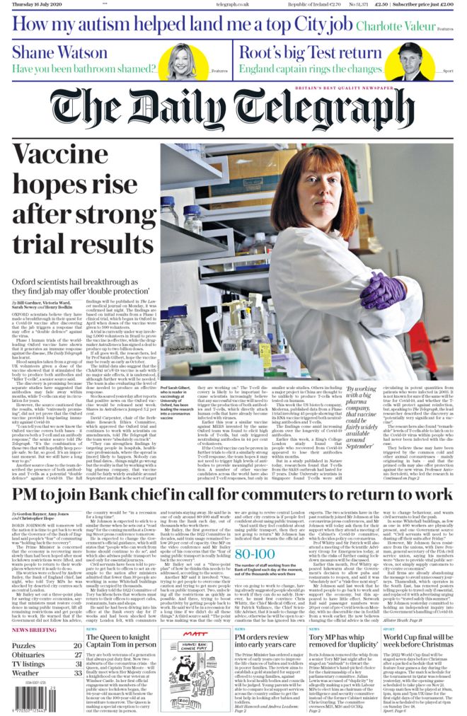 Στις ελπίδες των επιστημόνων από τις πρώτες δοκιμές για το εμβόλιο της Οξφόρδης κατά του κοροναϊού αναφέρεται η Daily Telegraph. Σύμφωνα με την εφημερίδα οι δοκιμές έδειξαν ότι το εμβόλιο δημιουργεί μια ανοσοαπόκριση ενάντια στον ιό.