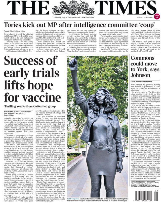 Στην επιτυχία των κλινικών δομικών του εμβολίου της Οξφόρδης αναφέρονται στο πρωτοσέλιδό του και οι Times.