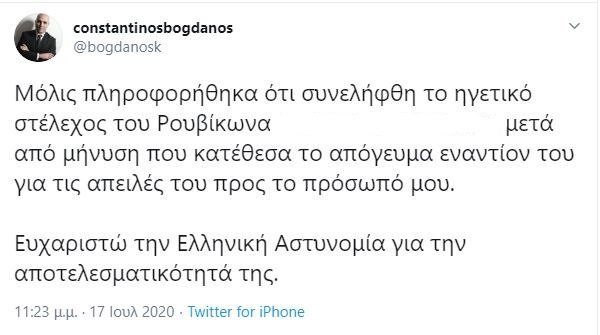 Συνελήφθη από την Ελληνική Αστυνομία μέλος του Ρουβίκωνα που απείλησε μέσω social media τον βουλευτή της Νέας Δημοκρατίας, Κωνσταντίνο Μπογδάνο.