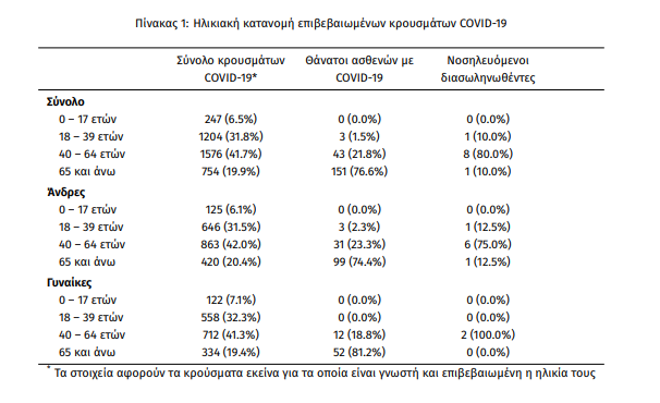 Η μέση ηλικία των κρουσμάτων είναι 47 έτη (εύρος 0 έως 102 ετών), ενώ η μέση ηλικία των θανάτων είναι 76 έτη (εύρος 35 έως 102 ετών). Η ηλικιακή κατανομή των (α) συνολικών κρουσμάτων, (β) των περιστατικών που κατέληξαν σε θάνατο και (γ) των ασθενών που νοσηλεύονται διασωληνωμένοι, είναι η ακόλουθη: