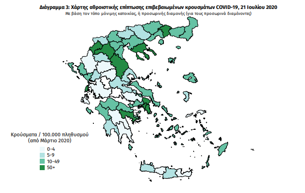 Ο χάρτης αποτυπώνει τη γεωγραφική κατανομή των συνολικών κρουσμάτων COVID-19 (από την αρχή της επιδημίας) ανά Περιφερειακή Ενότητα της χώρας, με βάση την δηλωθείσα διεύθυνση μόνιμης κατοικίας του ασθενούς, ή τη διεύθυνση προσωρινής διαμονής για τους τουρίστες και άλλους προσωρινά διαμένοντες στην Ελλάδα. Συμπεριλαμβάνονται τόσο κρούσματα με ιστορικό ταξιδίου (“εισαγόμενα”) όσο και κρούσματα με πιθανή εγχώρια μετάδοση.