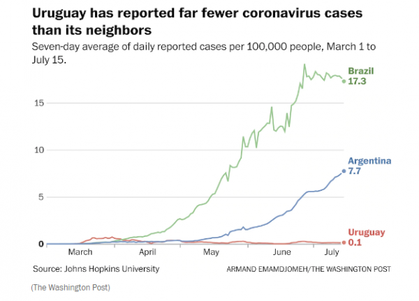 Όμως στους μήνες που μεσολάβησαν από τις 13 Μαρτίου, η χώρα των 3,4 εκατομμυρίων κατάφερε να κρατήσει τον ιό υπό έλεγχο. Στριμωγμένη ανάμεσα στη Βραζιλία, την χώρα που υποφέρει κάτω από το δεύτερο ισχυρότερο πλήγμα στον πλανήτη, και την Αργεντινή, που βλέπει επίσης τα κρούσματά της να αυξάνονται, η Ουρουγουάη έχει καταγράψει μόλις 1.064 κρούσματα και 33 θανάτους. Οι αριθμοί είναι ασυνήθιστα χαμηλοί για κράτος της Λατινικής Αμερικής, το οποίο μάλιστα κάνει εκτεταμένα τεστ.
