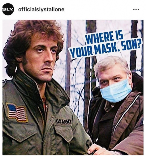 Ο 74χρονος ηθοποιός δημοσίευση ένα στιγμιότυπο από την ταινία δράσης του Ράμπο «Το πρώτο αίμα», του 1982 το οποίο δείχνει τον Ράμπο χωρίς μάσκα με τον ηθοποιό να αναρωτιέται: