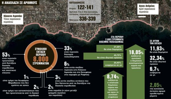 Στο Ειδικό Πολεοδομικό Σχέδιο, για το παραλιακό μέτωπο, η απαγορευτική ζώνη είναι μεγαλύτερη από αυτή που ορίζει η Εθνική νομοθεσία. Παρουσιάζονται ως κατεδαφιστέα όλα τα κτήρια της παραλιακής ζώνης, ενώ έχουν νόμιμες άδειες από την πολεοδομία που έχουν τηρηθεί, και θίγονται αυτονόητα ιδιοκτησιακά δικαιώματα των συμπολιτών μας.