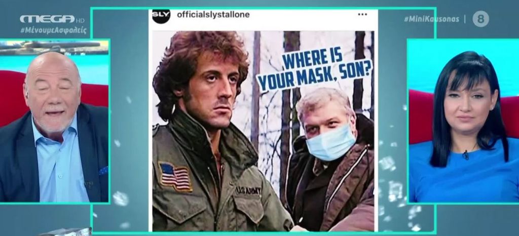 Ο 74χρονος ηθοποιός δημοσίευσε συγκεκριμένα ένα «πειραγμένο» στιγμιότυπο από την ταινία δράσης του Ράμπο «Το πρώτο αίμα», του 1982 το οποίο δείχνει τον Ράμπο χωρίς μάσκα με τον ηθοποιό να αναρωτιέται: «Πού είναι η μάσκα, γιέ μου;».