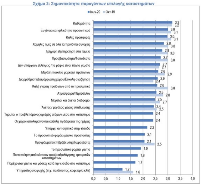 Αντίθετα η χρήση γαντιών και η παροχή τους κατά την είσοδο στο κατάστημα, όπως και η παροχή μάσκας δεν φαίνεται να παίζουν σημαντικό ρόλο. Θα πρέπει βέβαια να σημειωθεί, ότι κατά βάση τα κύρια κριτήρια επιλογής καταστήματος σε σχέση με την προηγούμενη μέτρηση του Οκτωβρίου του 2019, δεν έχουν διαφοροποιηθεί σημαντικά.