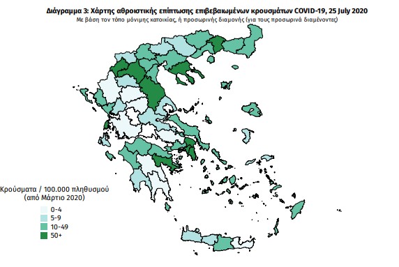 Εκ των συνολικών κρουσμάτων το 54.6% αφορά άνδρες, ενώ 1.166 (28.0%) θεωρούνται σχετιζόμενα με ταξίδι από το εξωτερικό και 2.095 (50.3%) είναι σχετιζόμενα με ήδη γνωστό κρούσμα.