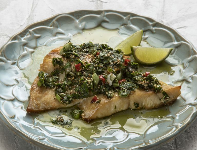 Ανακατεύουμε σε ένα μπολ τα κρεμμυδάκια, την πιπεριά, τον μαϊντανό, τον δυόσμο, τον χυμό λάιμ, το σουσάμι, το υπόλοιπο ελαιόλαδο και αλάτι. Σερβίρουμε βάζοντάς το πάνω από τα φιλέτα της πέρκας.