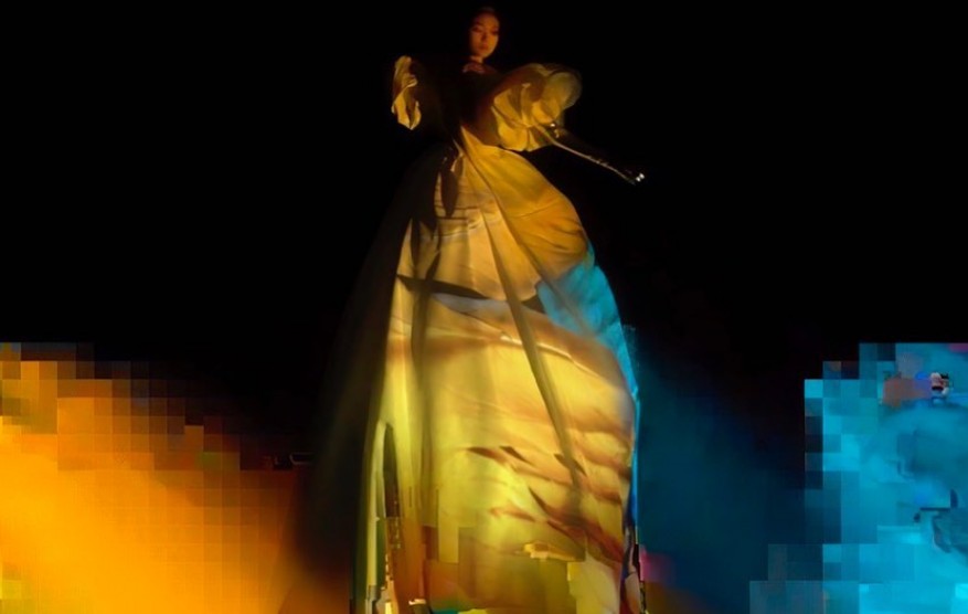 Μοντέλα εμφανίζονται σε μια σκοτεινή θεατρική σκηνή, είτε να κρέμονται από το ταβάνι είτε να στέκουν πάνω σε κολώνες, φορώντας φούστες που κυματίζουν ή topper, ενώ στην επιφάνεια προβάλλονται εικόνες φλογών, μπουκέτων λουλουδιών και άλλων στοιχείων της φύσης.