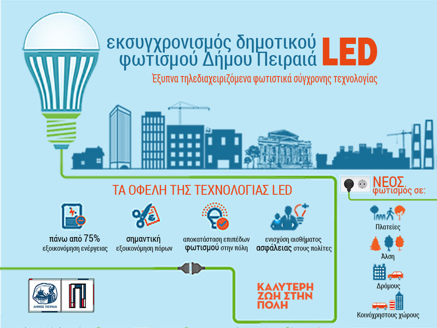 Ο Δήμος Πειραιά πετυχαίνει με τον τρόπο αυτό εξοικονόμηση ενέργειας πάνω από 75%, ενώ ταυτόχρονα εξοικονομεί πόρους και κυρίως αποκαθιστά τα επίπεδα φωτισμού στην πόλη, με «έξυπνα» τηλεδιαχειριζόμενα φωτιστικά, σύγχρονης τεχνολογίας και υψηλής ενεργειακής απόδοσης τύπου LED.