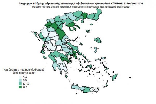 – δέκα (10) κρούσματα κατά τους ελέγχους που διενεργήθηκαν στις πύλες εισόδου της χώρας, – επτά (7) εισαγόμενα κρούσματα, που προσήλθαν αυτοβούλως, – εικοσιτέσσερα (24) κρούσματα στην περιφερειακή ενότητα Αττικής, -δεκαοκτώ (18) κρούσματα στην περιφερειακή ενότητα Θεσσαλονίκης, -τρία (3) κρούσματα στην περιφερειακή ενότητα Βοιωτίας, -Δύο (2) κρούσματα στην περιφερειακή ενότητα Ζακύνθου -Δύο (2) κρούσματα στην περιφερειακή ενότητα Καβάλας -Δύο (2) κρούσματα στην περιφερειακή ενότητα Κοζάνης -Δύο (2) κρούσματα στην περιφερειακή ενότητα Χαλκιδικής -Δύο (2) κρούσματα στην περιφερειακή ενότητα Λευκάδας -Ένα (1) κρούσμα στην περιφερειακή ενότητα Κεφαλονιάς -Ένα (1) κρούσμα στην περιφερειακή ενότητα Δωδεκανήσου -Ένα (1) κρούσμα στην περιφερειακή ενότητα Λέσβου -Ένα (1) κρούσμα στην περιφερειακή ενότητα Μαγνησίας, -Ένα (1) κρούσμα στην περιφερειακή ενότητα Πέλλας -Ένα (1) κρούσμα στην περιφερειακή ενότητα Φλώρινας