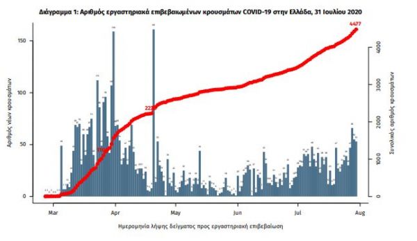 Συγκεκριμένα, 1267 (28.3%) θεωρούνται σχετιζόμενα με ταξίδι από το εξωτερικό και 2218 (49.5%) είναι σχετιζόμενα με ήδη γνωστό κρούσμα.