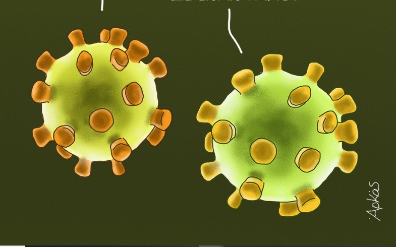 Ο Αρκάς, στο νέο του σκίτσο έχει αποτυπώσει δύο στελέχη του κοροναϊού να… συζητούν μεταξύ τους.