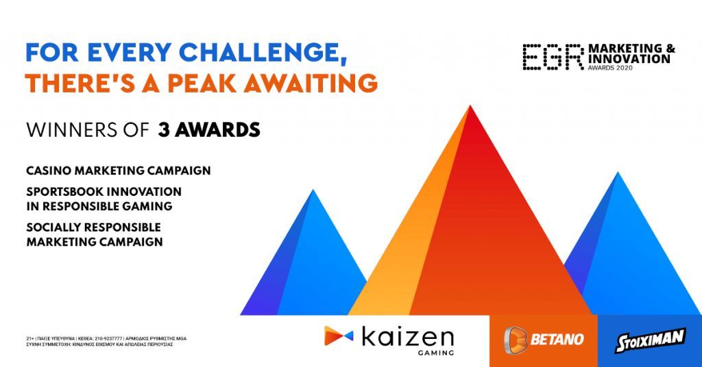 Λιγότερο από ένα χρόνο μετά την ανάδειξή της ως Mobile Operator of the Year στα EGR Operator Awards και Rising Star in Sportsbetting στα εξίσου σημαντικά SBC Awards ανάμεσα στις μεγαλύτερες εταιρείες online gaming παγκοσμίως, η Kaizen Gaming – όπως είναι η νέα επωνυμία της εταιρείας που δραστηριοποιείται σε 6 χώρες μέσα από τα brands Stoiximan και Betano – αποσπά τρία επιπλέον διεθνή βραβεία στα EGR Marketing & Innovation Awards 2020. Οι νέες αυτές διακρίσεις έχουν ιδιαίτερη σημασία, καθώς επιβεβαιώνουν μερικά από τα κεντρικά χαρακτηριστικά της Kaizen Gaming (Stoiximan / Betano): Υπευθυνότητα, Τεχνολογίες Αιχμής, Επικοινωνία, Κοινωνικό Αποτύπωμα – με άλλα λόγια μερικά από τα συγκριτικά της πλεονεκτήματα που ενισχύουν την ανταγωνιστικότητά της διεθνώς.