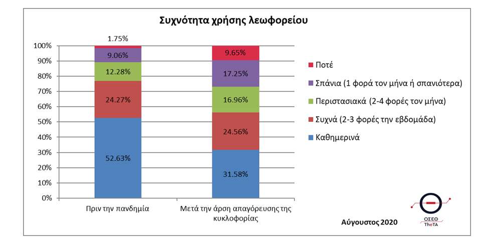 Η καθημερινή χρήση αστικής συγκοινωνίας μειώθηκε σχεδόν κατά 21 ποσοστιαίες μονάδες (από 52,63% πριν από την πανδημία σε 31,58% μετά την άρση απαγόρευσης κυκλοφορίας). Μάλιστα, ο ένας στους δέκα ερωτηθέντες δήλωσε ότι «δεν θα χρησιμοποιούσε πλέον τη δημόσια συγκοινωνία».