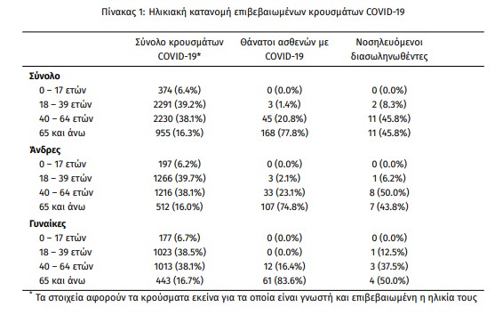Η μέση ηλικία των κρουσμάτων είναι 42 έτη (εύρος 0 έως 102 ετών), ενώ η μέση ηλικία των θανάτων είναι 77 έτη (εύρος 35 έως 102 ετών). Η ηλικιακή κατανομή των (α) συνολικών κρουσμάτων, (β) των περιστατικών που κατέληξαν σε θάνατο και (γ) των ασθενών που νοσηλεύονται διασωληνωμένοι, είναι η ακόλουθη: