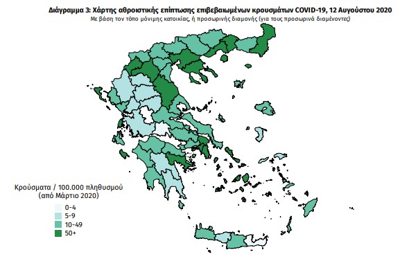 Ο χάρτης αποτυπώνει τη γεωγραφική κατανομή των συνολικών κρουσμάτων COVID-19 (από την αρχή της επιδημίας) ανά Περιφερειακή Ενότητα της χώρας, με βάση την δηλωθείσα διεύθυνση μόνιμης κατοικίας του ασθενούς, ή τη διεύθυνση προσωρινής διαμονής για τους τουρίστες και άλλους προσωρινά διαμένοντες στην Ελλάδα. Συμπεριλαμβάνονται τόσο κρούσματα με ιστορικό ταξιδίου (“εισαγόμενα”) όσο και κρούσματα με πιθανή εγχώρια μετάδοση.