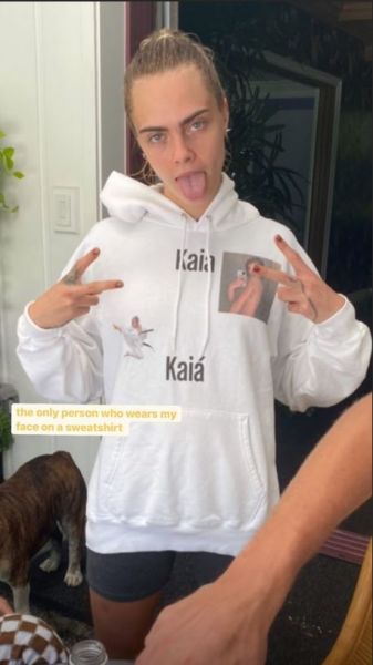 Μια τρίτη φωτογραφία δείχνει την Κάρα Ντελεβίν να φορά ένα πουλόβερ με το πρόσωπο της Κάια Γκέρμπερ τυπωμένο επάνω του.