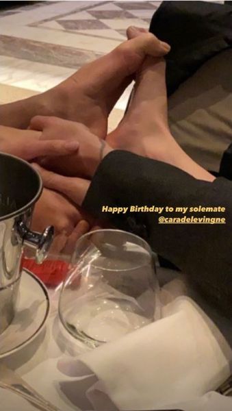 «Χρόνια πολλά στην solemate μου Κάρα Ντελεβίν», έγραψε το 18χρονο σουπερμόντελ, σε μια φωτογραφία με τα πόδια τους μπλεγμένα.
